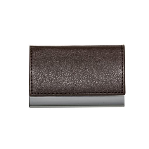 Porta cartão de metal com detalhe em couro sintético marrom. Couro texturizado e costura marrom, parte interna revestida de veludo.