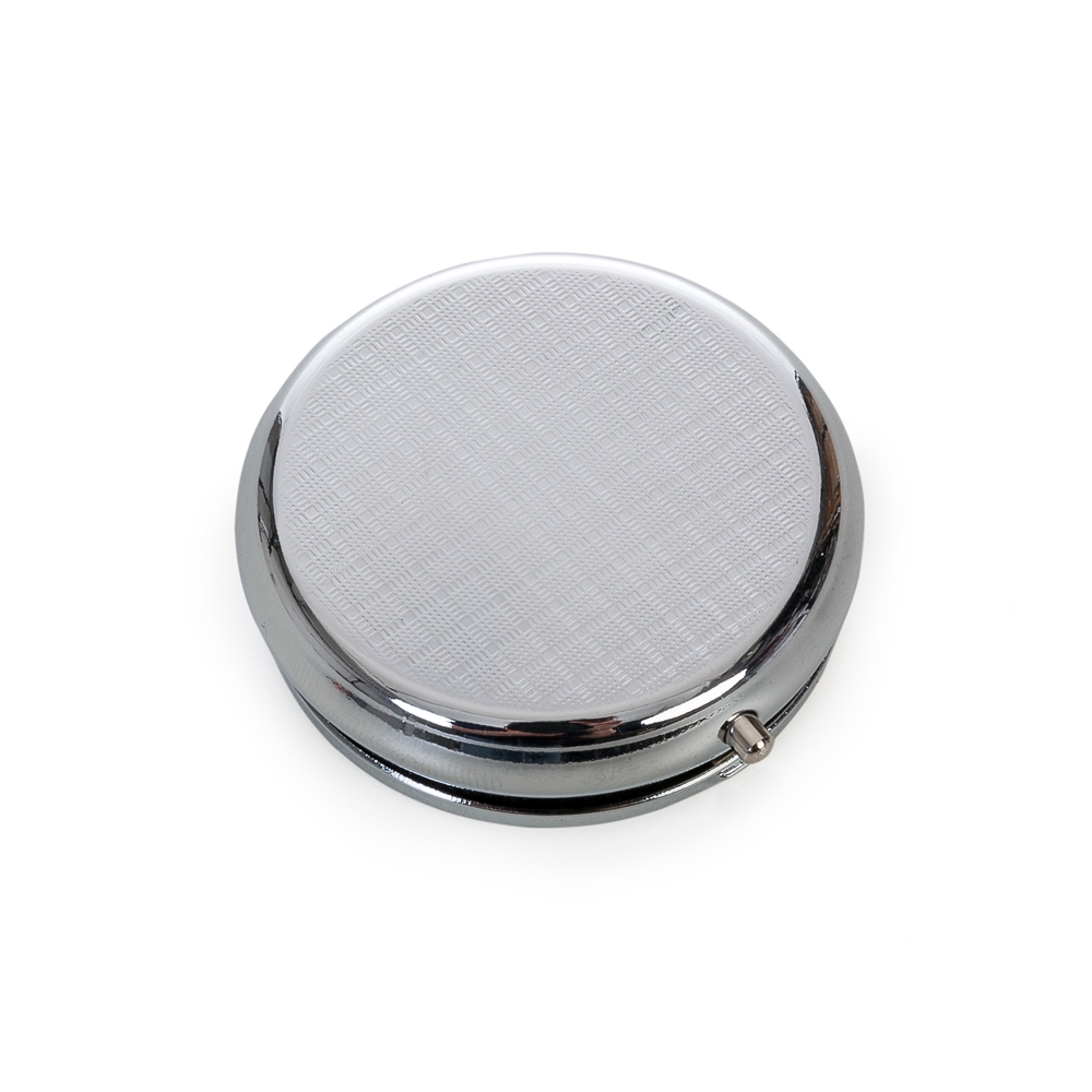 Porta comprimidos redondo de metal, parte superior (tampa) brilhante externo e interno e lado inferior com detalhes estilo mosaico. Parte interna com três divisórias plásticas, possui um botão para abrir.